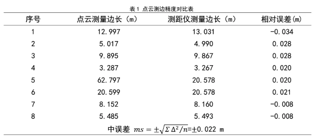為保證項(xiàng)目精度,進(jìn)行了精度對比分析檢測。共選取了8條邊長進(jìn)行長度測量,8條邊長均勻分布,長度也不一樣,同時(shí)為減小偶然誤差,每條邊長均測量5次,取平均值作為精度驗(yàn)證測量結(jié)果。最終各條邊長精度對比表如表1所示,通過表中可以看出,最大誤差為3.4cm,最小誤差0.8cm,中誤差為2.2cm