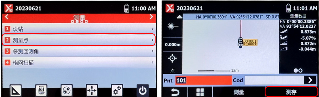 點擊【測量點】,在測量程序主界面,完成點號、EDM、目標高等設置后,照準待測點,點擊【測存】,完成常規(guī)測量。