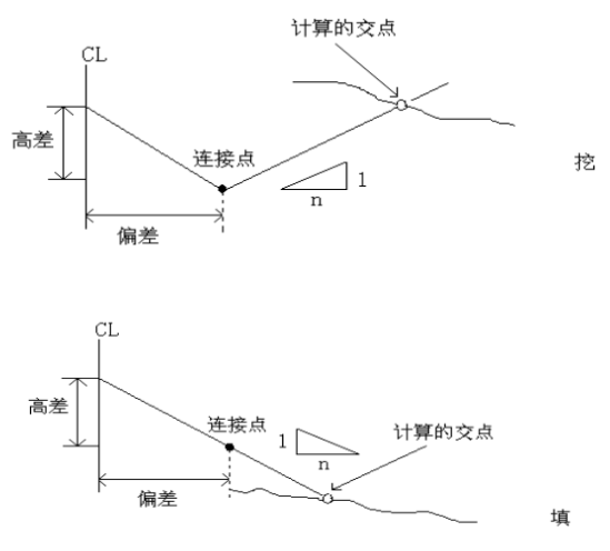 填或挖是由連接點的估計高程來確定,若高程在連接點的高程之上,則用挖斜坡,否則用填斜坡。